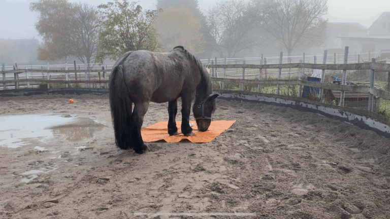 Direkt am Anfang geht es darum, wie wichtig es für Pferde ist, ihre Umgebung zu erkunden und dieses natürliche Verhalten auszuleben. Dieses Verhalten wird vielen Pferden eher aberzogen. Heute wollte ich mit Lukas ausprobieren, wie er bei neuen Gegenständen reagiert. Ich habe also im Roundpen eine Plane, eine Plastikflasche, ein kleines Handtuch und einen Ball platziert und ihn frei entscheiden lassen, ob er dahin gehen möchte oder nicht. Lukas hat mich überrascht, denn er ist ohne Vorbehalte zu allen Gegenständen gegangen und hat sie untersucht. Ich war total stolz auf ihn, denn das zeigt ja, wie sehr er mir und der Situation vertraut.
